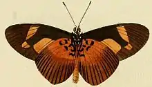 P. epaea is distinguished by having the hindmarginal spot of the forewing narrow and of fairly uniform breadth, at the hindmargin not or scarcely broader than half the hindmargin and not filling up the base of cellule 2, while the black marginal band on the upperside of the hindwing is in the d suddenly much widened at the apex, but in the female often very broad. On the under surface of the hinclwing the basal area is brighter red-yellow than the other parts of the wing. - epaea Cr. (58 a). male- Ground-colour of the hindwing above, hindmarginal spot and subapical band of the fore wing yellow-brown; hind wing beneath in the distal part more or less suffused with brown-grey and in the middle somewhat lighter. female Subapical band and hindmarginal spot of the forewing white and also a median band on the hindwing, 7 mm. in breadth, which forms a continuation of the hindmarginal spot of the forewing; the whole distal half of the hindwing, on the other hand, black-grey on both surfaces, with black veins and streaks. Senegambia to Angola and the upper Congo. -female -ab. lutosa Suff. is a female form which differs in having the white markings of the typical female light clay-yellow and the proximal part of the dark distal half of the hindwing above broadly light brown to dark yellow-brown or olive-brown; the pure black outer part of the distal half consequently retains almost the same shape as in the male. Cameroons to the Congo. - insularis Auriv. is a race in which the male only differs from the type-form in having the subapical band of the forewing whitish yellow above and white beneath; in the female the subapical band of the forewing is pure white, but the hindmarginal spot of the forewing and the hindwing are coloured and marked quite as in the male ; the base of the hindwing beneath is light yellow instead of red- yellow. Island of Fernando Po. - melina Thur. is only known in the male; the light markings of the upper surface are dull ochre-yellow and the hindmarginal spot of the forewing is differently shaped, as its proximal side runs quite parallel with the costal margin and if produced would intersect the apex of the wing; in addition the distal side of the hindmarginal spot is bordered by two straight lines and forms a distinct angle. Nyassaland. - kivuana Jord. the markings of the forewing nearly as large as in the type-form, but the subapical band light cream-coloured and the hindmarginal spot light tan-yellow; the hindwing before the middle with a narrow yellowish white transverse band, not sharply defined distally; all the markings beneath yellowish white. -female : all the markings pure white; the subapical band of the fore wing narrower than in the type- form; the transverse band of the hindwing also narrower and more sharply defined. Island of Kwidgwi in Lake Kivu. - paragea Sm. (59c) is distinguished by having the markings very narrow and also in the male white; the subapical band of the forewing is only 1-2mm. in breadth and often almost broken up into spots; the hindmarginal spot is about 3 mm. in breadth and sometimes indistinct or obsolete at the hindmargin; the transverse band of the hindwing is 5mm. in breadth, sharply (or not sharply -- angustifasciata Grunb.) defined and not or scarcely extending beyond the apex of the cell. Uganda and Sesse Islands. - homochroa Jord. (59 e). Both sexes similarly coloured and marked and agreeing with the male of the type-form. The orange-yellow colour of the upper surface is somewhat lighter than in the type-form and the dark marginal band on the upperside of the hindwing is much narrower and terminates at the middle of the hindmargin. Abyssinia. [4]