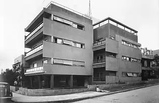 Shulman designed the Zeire Zion pavilion for the Jewish National Fund exhibition in Brussels before returning to Tel Aviv, where he practiced residential and commercial architecture from 1931 to 1947.[8] Shulman's innovative design for an apartment building at 3 Mapu Street in 1937 became the focus of an unusual coalition of prominent architects of the time who supported his efforts to fight the city's municipal building department, who had rejected the plan for the building. Shulman's skillful creation of a "cubist and precise" sense of monumentality for a modest building was noted by architect/planner Nahoum Cohen in Bauhaus Tel Aviv: An Architectural Guide.[9] Although it had deteriorated over the years, it was restored in 2012 by architect and conservationist Mimar Naor, and commemorated with a plaque highlighting its originality.[10] Views of the restoration are included in a new book Preservation and Renewal- Bauhaus and International Style Buildings in Tel Aviv[11] published by Bauhaus Center Tel Aviv.