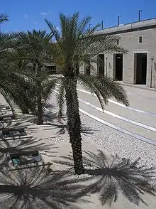 The overall concept was for the design, which includes a larger 65-acre (26 ha) site that includes a road and an interchange in addition to the 5-acre (2.0 ha) Central Garden, was for it to relate strongly to the surrounding landscape.[2] Plants common to the area were selected based on their regional presence. The gradual elevation change (approximately 15 feet (4.6 m)[3]) within the garden is meant to symbolize the ascent from Tel Aviv to Jerusalem while also accommodating the practical requirement of the connecting various elevations of the parking garages with adjacent roads. Aronson symbolizes the Mediterranean coastline through the formal arrangement of materials like stone (a local limestone) and stainless steel. Gravel is used to represent the beaches of the western border of Israel, and a grid of palm trees recalls the seaside promenades that are growing in popularity within Israel. The grid arrangement also references the agricultural plantings of palm trees in the region. With the shift in elevation through the site comes a change from paved surface to planted areas of wheat fields, grasses, and orange groves. Small channels of water run through the garden, using a traditional technique for areas prone to rapid evaporation and indicating the need for human intervention in hydrating the arid landscape. The uppermost terrace contains a grove of olive trees, a tree common to the Judean Mountains around Jerusalem and the highest elevations within the country. Shlomo Aronson and project architect Barbara Aronson intended for the garden to be an abstraction of the region that allows visitors to gain a “deeper feeling of place”[4] regardless of religious or political affiliations.