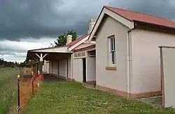 - The passenger station comprises a central brick pavilion enclosing two waiting rooms and a ticket office for the Station Master, flanked by freestanding brick pavilions for the lamp room at the north end and toilets at the south end. The small yards between the pavilions were enclosed with corrugated iron screen walls and roofs. Each of the rooms was accessible from the 264 feet (88 m) long platform on the eastern side. A platform awning over the central portion across the width of the central pavilion provided shelter for passengers and platform equipment.[5][1]