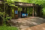 The property sits "surrounded by trees in a ravine" and "was held up as a model for steel home craftsmanship."[2] Textile artist Ben Rose and his wife, Francis, moved into the property the same year. An adjoining pavilion meant to showcase the Roses' collection of exotic sports cars was added by David Haid, Speyer's student, in 1974.[3] The house was designated an official local landmark in 1987.[4] The two buildings are steel framed, rectangular, glass-and-wood boxes, and similar to Mies' iconic Farnsworth House, are both lifted off the ground on pylons.[1]