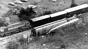 Ahead of it, a ten-carriage local train was carrying 1,090 passengers home to the capital after spending a weekend in fashionable Zárate on the banks of the Paraná River, but had come to a halt due to 'fuel injector trouble'.[6] Despite being stopped for 40 minutes as they tried to fix the problem,[5] the crew of the local train failed to provide protection and at 20:15 the express ran into the back of it at a speed of 65 mph. The two diesel locomotives 'totally destroyed' the rear car and telescoped the next car through almost the entire length of the third from rear car, pushing it 80 yards down the track,[4] though some passengers managed to jump clear. All the deaths and major injuries were aboard the local train.[3]