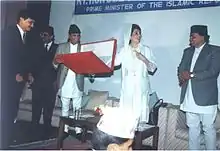 President Ghulam Ishaq Khan was constitutionally obliged to invite Bhutto to form the next government, but was reticent to do so. Under growing pressure—including from the U.S., a key ally—he reluctantly did so two weeks after the election.[159] To build her government, Bhutto formed a coalition with the Muttahida Qaumi Movement (MQM) party, which had 13 seats in parliament,[160] an action that upset the Sindhi nationalist faction within her party.[161] She was sworn in as the Prime Minister of Pakistan on 2 December 1988.[162] Bhutto became the first female Prime Minister in a Muslim-majority country,[163] as well as Pakistan's second nationally elected Prime Minister.[164] At 35 years old,[165] she was the youngest elected leader in the Islamic world,[166] the world's youngest Prime Minister,[167] and the youngest female Prime Minister ever elected.[168] After her election, party workers were encouraged to refer to her as Mohtarma ("respected lady").[169] There was hope among many observers that her premiership would mark a new era of multi-party democracy, growing gender equality, and better relations with India.[170] She personally stated that her electoral victory was "the tipping point in the debate raging in the Muslim world on the role of women in Islam".[171]