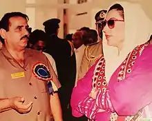Bhutto often argued with Beg, Gul, and Khan over her desired policies, and—according to Allen—"won some battles but ultimately lost the war" against them.[190] Bhutto succeeded in getting Khan's approval to change two of the country's four provincial governors;[191] she appointed General Tikka Khan, one of the few senior military officers who were loyal to her, as the Governor of Punjab.[192] She sought to replace the chair of the joint chiefs of staff, Iftikhar Ahmed Sirohey, but President Khan refused to permit this.[191] Bhutto disliked Khan's hostile attitude toward her, but he had the backing of the military.[193] In the presidential election, Bhutto initially proposed Malik Qasim, who had been involved in the MRD, as the PPP's nominee, but the military refused to accept this. Bhutto relented and agreed that Khan could be nominated as the PPP's presidential candidate.[194] Bhutto also wanted to replace Mahbub ul Haq as a finance minister, but again the military opposed her. Compromising, she accepted ul Haq's continued role as finance minister but appointed Wasim Jafri as her financial advisor.[193] Beg made it clear to Bhutto that the military would not tolerate her interference in their control of the defence and foreign affairs.[193]