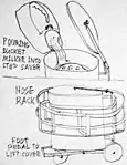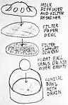 Following milking each cow, the bucket milker would be dumped into the receiver cart. A foot pedal on the base of the cart lifted the cover, which kept contaminating dust and debris out of the cart, and allowed the farmer to hold the heavy bucket milker with both hands while pouring. A diffuser plate in the top of the cart prevented milk from splashing out while rapidly pouring the milk, and a large filter disk under the diffuser removed any debris from the milk.