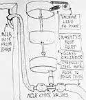 An automatic vacuum breaker in the milkhouse cyclically pulled milk from the cart into a glass jar using system vacuum, followed by a release of vacuum to atmospheric pressure, allowing the milk to flow into the bulk tank by gravity flow. When the float level in the jar dropped to setpoint, system vacuum was reapplied to restart the process. Check valves on the vacuum breaker milk hose prevented milk from flowing backwards to the cart when the jar vacuum was released.