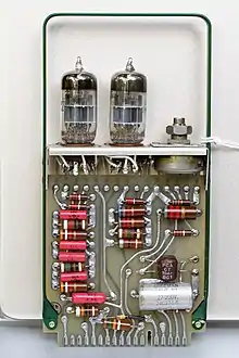 The G-15 has 180 vacuum tube packs and 3000 germanium diodes.[7] It has a total of about 450 tubes (mostly dual triodes).[8] Its magnetic drum memory holds 2,160 words of twenty-nine bits. Average memory access time is 14.5 milliseconds, but its instruction addressing architecture can reduce this dramatically for well-written programs. Its addition time is 270 microseconds (not counting memory access time). Single-precision multiplication takes 2,439 microseconds and double-precision multiplication takes 16,700 microseconds.