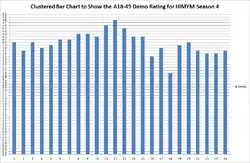 This season is currently the second highest rated season of How I Met Your Mother in terms of viewership, at an average of 9.42 million viewers.[30] However, it is currently the highest rated in terms of the important Adults 18-49 demographic, which is what advertisers use to determine how much a 30-second advertising spot costs. Season 4 averaged 4.0/10 in terms of rating/share in the Adults 18-49 demographic.