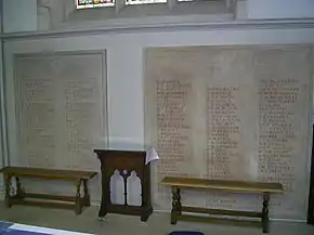 During the Second World War, the Master of the College was Sir Will Spens, who was also Regional Commissioner of Civil Defence for the Eastern Region: had Hitler invaded, he would have been in charge of running Eastern England. The college housed various government departments whilst the then Master was also the Regional Commissioner. Corpus would have hosted the organisation which may have been required to act as an autonomous government authority if central government was incapacitated.[23] This has led to a persistent rumour of a network of tunnels under the college excavated for this purpose. While there are extensive wine cellars, there is no evidence of such tunnels.[24] During the war there were fewer undergraduates in residence, but the space was taken up by cadets and officers of the armed services taking short courses. Due to the increase in student numbers in the 1930s, Corpus is one of the few British institutions to have lost more members in the Second World War than in the First. Their names are inscribed in the Chapel.