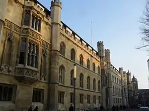 In the 1740s Archbishop Thomas Herring left £1000 for the rebuilding of the college and this led to several abortive attempts to start construction. In 1770 Matthias Mawson, former Master and Bishop of Ely, bequeathed £3000 to defray the costs of demolishing and rebuilding the college but this was not enough. It was not until 1822 when £55,000 had accrued in the rebuilding fund that efforts started. William Wilkins, who had recently completed major works at Downing, King's, and Trinity, was appointed architect and the New Court was completed in 1827 in a neo-gothic style.[6] This involved the demolition of several buildings, including the Elizabethan chapel. The chapel currently standing in New Court is part of the 19th-century construction. Completion of a new, larger court allowed for many more students and numbers increased from 48 to 100.