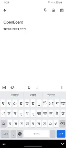Indic Keyboard[23] is a free and open-source keyboard software for Android developed by Indic Project, available under Apache License. It supports common Bengali layouts, namely Probhat, Avro and Inscript.