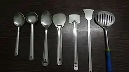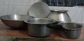 A korai is a cooking vessel for most Bengali sauces and stir-fry. The dekchi (a flat-bottomed pan) is used generally for larger amounts of cooking or for making rice. It comes with a thin flat lid which is used also to strain out the starch while finishing up cooking rice. The tawa is used to make roti and paratha.[47] The other prominent cooking utensil is a hari, which is a round-bottomed pot-like vessel. The three mentioned vessels all come in various sizes and in various metals and alloys.[48]