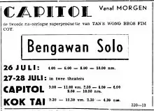 Two years later Young wrote another film regarding the Solo River, Ditepi Bengawan Solo. This work had a different plot and different cast.[9] Bengawan Solo was remade in 1971, with Sofia WD, Willy Wilianto (Joshua Wong's son), and Bay Isbahi directing. In this remake, Wenangish (played by Rima Melati) died after being hit by a train.[10]