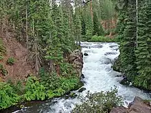 Benham Falls are rapids of the Deschutes River located between Sunriver and Bend, Oregon, United States. With a pitch of 22.5°, they are rated Class 5 for watercraft, and are the largest falls on the upper Deschutes.