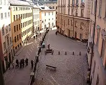 The slopes were originally named Svartbrödrabrinken and Svartmunkabrinken ("Black Brother's/Monk's Slope") after the Black Friars' Monastery located on the western side of the southern slope until the Reformation (1520–1530). The monastery was built on land given to the Dominicans following the coronation of King Magnus Eriksson (1316–1377) in 1336. A cellar from the monastery, which served as a lodging and still contains the original stoves, is found under the present building at number 4.[1][2] A pattern of sets in the street Prästgatan still shows the extent of the monastery walls, and human bones discovered during an archaeological excavation in 1993 showed the graveyard of the monastery extended well into the northern part of the present southern slope.[3]