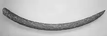 Carved elephant tusks function as a visual bridge between agbon, the material realm, and erinmwin, the world of spirits and ancestors. The whiteness of the ivory tusk is like orhue, a pure, white, kaolin clay considered to be the essence of harmony and spirituality. Orhue is ubiquitous in Edo rituals; it is applied to the faces and bodies of participants in ceremonies, blown into the air in powdered form as purification, painted in sacred designs on shrine floors, and mixed into the food offered to worshipers. In each of these uses, orhue insures calmness, health, and well-being. Orhue is also applied to the surface of the clay altar, which is constructed of symbolically charged earth and water and, in the past, was placed over the grave of the Oba's father. According to Barbara Blackmun, "The whiteness of the ivory tusk therefore enhances the sanctity and effectiveness of the altar. The motifs carved upon the ivories are only one part of a potent ensemble designed to furnish a point of contact not only between the reigning king and his newly- deified predecessor, but also with his ancestral lineage of divine rulers and other spiritual forces guiding the kingdom."[4]
