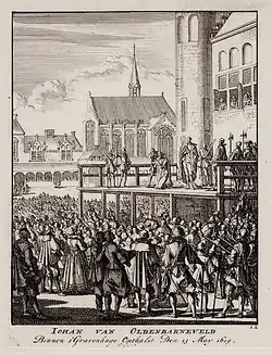 Meanwhile, the trial of Oldenbarnevelt had proceeded behind closed doors, without much being made public except for vague utterances by the likes of Aarssens that "the life of the prisoners was incompatible with the security of the state".[26] The French ambassadors addressed the States General on 12 December and expressed the hope that the trial would be brief and the prisoners be judged by their own court (i.e. the Hof van Holland), according to the established laws. They added that the king of France demanded clemency in view of the services Oldenbarnevelt had rendered, and the old friendship between the two countries. The response of the States General, drafted by Aarssens, on 17 December, feigned surprise about the reproach by the French king, and predicted that the king would think differently when he learned from the verdicts, which were expected soon, about the gravity of the conspiracy.[27]