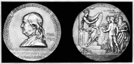 The Benjamin Franklin Medal presented by the American Philosophical Society located in Philadelphia, Pennsylvania, U.S.A., also called Benjamin Franklin Bicentennial Medal, is awarded since 1906. The originally called "Philosophical Society" was founded in 1743 by Benjamin Franklin. The award was created to remember the 200th anniversary of the birthday of Franklin.[1][2][3] The Museum of Fine Arts in Boston has this medal in its collection.[4]