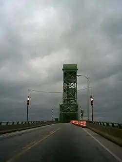 The Benjamin Harrison Memorial Bridge is a vertical-lift bridge that spans the James River between Jordan's Point in Prince George County and Charles City County near Hopewell, Virginia. The bridge carries vehicle traffic of State Route 106 and State Route 156, and is owned by the Virginia Department of Transportation (VDOT). It is named after Benjamin Harrison V, a signer of the Declaration of Independence and a Governor of Virginia, who lived nearby at Berkeley Plantation.