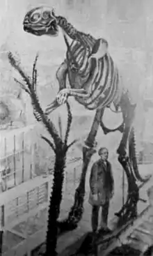 Meanwhile, possibly due to Derby's connections, Hawkins was appointed assistant superintendent of the Great Exhibition of 1851 in London. The following year, he was appointed by the Crystal Palace company to create 33 life-size concrete models of extinct dinosaurs to be placed in the south London park to which the great glass exhibition hall was to be relocated. In this work, which took some three years, he collaborated with Sir Richard Owen and other leading scientific figures of the time: Owen estimated the size and overall shape of the animals, leaving Hawkins to sculpt the models according to Owen's directions.[2][3]