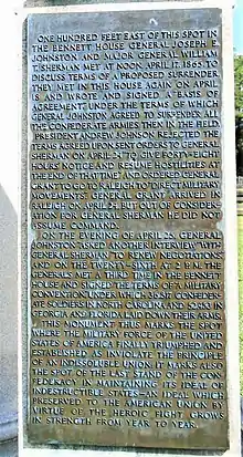 Bennett Place is a former farm and homestead in Durham, North Carolina, which was the site of the last surrender of a major Confederate army in the American Civil War, when Joseph E. Johnston surrendered to William T. Sherman. The first meeting (April 17, 1865) saw Sherman agreeing to certain political demands by the Confederates, which were promptly rejected by the Union cabinet in Washington. Another meeting had to be held (April 26) to agree on military terms only, in line with Robert E. Lee’s recent surrender to Ulysses S. Grant. This effectively ended the war.