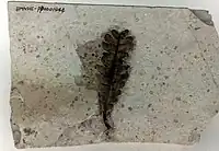 The oldest confirmed fossils of bennettitaleans are leaves of Nilssoniopteris shanxiensis, a species from the upper part of the Upper Shihhotse Formation in Shanxi Province, China.[5] This strata is dated to the early Kungurian stage of the early Permian (Cisuralian), around 281 million years ago.[24] Supposed Carboniferous-Permian records of Pterophyllum do not have conclusive bennettitalean affinities or have been reinterpreted as cycad foliage in the form genus Pseudoctenis.[25] True Permian records of benettitalean leaves are rare; outside of the Shihhotse Formation they are only found in the Late Permian (likely Changhsingian)-age Umm Irna Formation in Jordan.[5] This formation is notable for the early occurrence of other Mesozoic-style flora, including the earliest records of corystospermalean foliage (Dicroidium), podocarpacean conifer branches (Elatocladus), and Triassic-style zamiinean cycads.[26] The order Fredlindiales (containing the genus Fredlindia) from the Late Triassic of Gondwana appears to be closely related to Bennettitales, but differs from it in some aspects of its reproductive organs.[15]