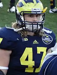 Bennie Oosterbaan's jersey number 47 was the first Michigan football jersey number retired,[14] and until 2011, it was one of only five numbers retired by the Michigan football program. In 2012, the Michigan Football Legends program led to the reissue of the No. 47 jersey to linebacker Jake Ryan, bearing a patch (pictured at right) honoring Oosterbaan. Each player to wear the jersey will also dress at a locker bearing a plaque with Oosterbaan's name and his time of tenure at Michigan.[26][27]