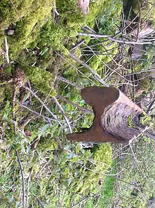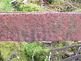 Several holed sandstone blocks have been found built into the 'Hurry' at and it is likely that the wrought iron rails were spiked to these large stone sleepers. Granite railway sleepers shipped in via Ardrossan from Ailsa Craig are also said to have been used. The rail height is somewhat less than a typical modern rail as it was not designed to carry the weight of a locomotive.[21] The rails are 2+1⁄2 in (64 mm) high, 2+3⁄4 in (70 mm) wide at the bottom (the foot), and 1+1⁄2 in (38 mm) wide at the top (the head). The central web is therefore much shorter than conventional rails. When the Ardrossan and Johnstone Railway was converted to standard gauge c. 1840, heavier rails were used, the lighter version probably being the type recovered from Millburn.[22]