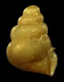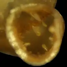 The width of the shell is 2 mm.[2] The aperture of the shell is protruded.[2] There are 13-15 denticles within the aperture about 400 μm from the lip.[2]