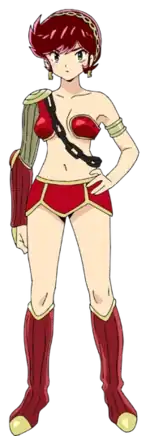 Regarding Benten's design, Takahashi intended to dress her similarly to the stereotypical appearance of outlaw motorcycle club members; the author portrayed her wearing a chainmail bikini and riding a flying motorcycle, as well as giving her a high-tech bazooka as her default weapon.[5][3] In order to contrast the character with Benzaiten – the latter usually described as a wise, elegant and artistic figure – Takahashi decided to give Benten a tomboyish and violent persona.[3] During an August 2022 interview, Japanese voice actress Shizuka Ishigami stated that Benten, despite possessing a strong, masculine personality, is "perfectly capable of understanding the appeal of being a woman".[6]