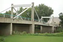 The first proposals for the current bridge were submitted in November 1955, with a cost estimate of $140 thousand (equivalent to $1.1 million in 2021).[14] The bridge was designed so that there was a clearance of 2 feet 9 inches (0.84 m) higher than the 1933 Yakima River flood level.[5][15] The new bridge was to be built 600 feet (180 m) downstream from the previous bridge,[16] but was built 300 feet (91 m) upstream instead.[17] The second bridge had been in place for 40 years and was seeing an average of 1,700 cars-per-day over the bridge.[16] By comparison 9,500 cars on an average 2012 day travel over the current bridge.[2]