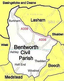 The civil parish of Bentworth, starting to the north and working clockwise, extends from north of Burkham House, then runs south east along the A339, turns south to Thedden Grange and the hamlet of Wivelrod, then west to north of Medstead and north again to Ashley Farm and back to the Burkham area. Originally (i.e. the ancient parish) is much larger, incorporating nearby settlements like Bradley, Beech, Moundsmere, Medstead and Lower Wield which lacked their own churches. The parish gained a 95 acres (38 ha) in 1991 by regaining the Home Farm country park from the parish of Bradley.[40]