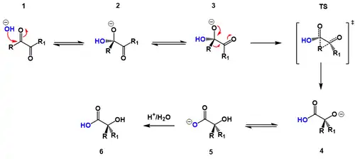 A hydroxide anion attacks one of the ketone groups in 1 in a nucleophilic addition to form the alkoxide 2. The next step requires a bond rotation to conformer 3 which places the migrating group R in position for attack on the second carbonyl group. In a concerted step, the migrating R group attacks the α-carbonyl group forming another alkoxide with concomitant formation of a keto-group at the other carbon. This migration step is rate-determining. This sequence resembles a nucleophilic acyl substitution. Calculations show that when R is methyl the charge build-up on this group in the transition state can be as high as 0.22 and that the methyl group is positioned between the central carbon carbon bond!