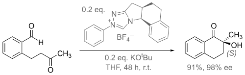 The asymmetric version of this reaction has been performed by utilizing chiral thiazolium and triazolium salts. Triazolium salts were found to give greater enantiomeric excess than thiazolium salts.[8] An example is shown below.[9]
