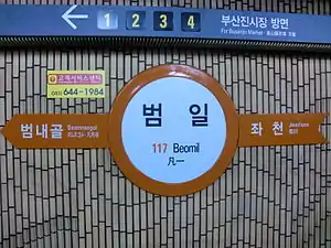 Beomil Station (Korean: 범일역; Hanja: 凡一驛) is a station of the Busan Metro Line 1 in Beomil-dong, Dong District, Busan, South Korea. The station is unrelated to the Beomil Station of Korail.