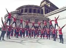 During the dance dancers wear only traditional Armenian dress (Armenian: տարազ, taraz). The central objective of the dance is to create a fortress, which is a 2-storey human wall. In order to achieve this, dancers stand on top of each other's shoulders.[1]