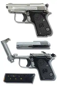 The Beretta 950 is a semi-automatic pistol designed and manufactured by Beretta since 1952. It builds on a long line of small and compact pocket pistols manufactured by Beretta for self-defense. It was intended to be a very simple and reliable pocket pistol.[1] It appears in several James Bond films[2]