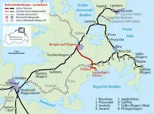 ![]() Route of the Bergen auf Rügen-Lauterbach Mole line | ||||||||||||||||||||||||||||||||||||||||||||||||||||||||||||