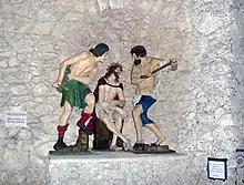 To the east of the main church is a kind of artificial mountain, the "Kalvarienberg" (Calvary Hill), which is filled with passages and grottoes, in which appear statuary depicting the 24 Stations of the Cross. The statues, which are "vividly, even garishly painted" (Jones 2009:51) were the work of Franciscan friars, working over 250 years ago.[5] In historical times the Kalvarienberg was a destination for pilgrimages; according to Jones, in its time the Kalvarienberg "was regarded as the eighth wonder of the world."[6] As in historical times, visitors climb up and down the little mountain and go within it, viewing the stations in succession.