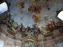 The Bergkirche is architecturally unusual and is built in two parts. The main section, the church proper, is approximately a square. The interior is in Baroque style; Humphreys and Bousfield call it "a trompe-l'œil fantasy in pinks and greys".[2] The ceiling takes the form of a dome, which was painted in fresco in the late 18th century by J. W. Baumgartner.[3]
