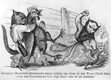 In early September 1861, both federal and Confederate troops entered Kentucky.[9] Magoffin declared both sides equally guilty of violating Kentucky's neutrality and demanded that both sides withdraw.[9] A resolution calling for immediate withdrawal by both Union and Confederate forces was defeated in the legislature.[9] Instead, the legislature passed a resolution ordering only the Confederate troops out of the state.[4] Magoffin vetoed the resolution, but his veto was overridden, and he obediently issued the order for the Confederates to withdraw.[7] In November 1861, a self-constituted convention of southern sympathizers met at Russellville, Kentucky, in order to form a provisional Confederate government for the state.[10] Despite his southern sympathies, Magoffin denounced the actions of this convention.[10]