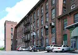 Berkeley Mill Village is a historic district encompassing the mill village of Berkeley in Cumberland, Rhode Island. The village is roughly bounded by Martin Street and Mendon Road on the north and east, railroad tracks to the west, and St. Joseph Cemetery to the south. The village, including a mill complex and mill employee housing, was built in 1872 by the Lonsdale Company. Most of the residential structures built are two-story brick duplexes, although Mendon Street is lined with a number of fine Queen Anne Victorian houses. A c. 1892 Stick-style church building (now used for non-religious purposes), stands on Mendon Street at the northern end of the district.[2]