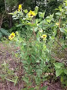 Berlandiera texana is an herb up to 120 cm (48 inches or 4 feet) tall. It has several flower heads with yellow ray florets and red disc florets. Flowers bloom March to November. The species is found in dry locations in open woodlands and thickets.[5] The Latin specific epithet texana is in reference to the state of Texas, where it grows.[2]