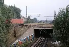 The groundbreaking ceremony for the fundamental renewal of the line between the Berlin Ringbahn and Königs Wusterhausen, including the branch to Berlin-Schönefeld Airport, as part of the Grunderneuerung S-Bahn Berlin, S9 Süd ("fundamental renewal of the Berlin S-Bahn, S9 South") project was held on 12 July 2006.[17] In addition to the S-Bahn facilities, this work includes work on the long-distance rail tracks that run parallel on this section. It includes the complete reconstruction of the S-Bahn stations of Adlershof and Baumschulenweg in new locations, the renewal of Schöneweide station, as well as the renovation of seven railway overpasses, including the erection of a new tied-arch bridge over the Britz Canal and the Teltow Canal to allow widening of the waterways. In addition, the renewal of the tracks, the erection of electronic interlockings and the renewal of the traction power supply including substations and overhead line systems are planned. Wildau S-Bahn station will be adapted for the disabled and a second platform track will be installed to allow trains to cross. The cost is estimated to be €350 million.[18][19] After completion of the construction work, the line speed for the S-Bahn would be increased from 80 to 100 km/h (50 to 62 mph).[17]