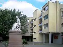 The Peace Column (German: Friedenssäule) is a column located in Mehringplatz in Berlin, Germany. Designed by Christian Gottlieb Cantian and erected in 1843, the 19-meter column is topped with a brass status of Victoria, goddess of victory, designed by Christian Daniel Rauch. In 1876, allegories of the four victorious allies of Waterloo (or Belle Alliance in Prussian historiography) were added, and in 1879 two more sculptures followed: The Peace by Albert Wolff and Clio, writing the history of the Wars of Liberation (Befreiungskriege) by Ferdinand Hartzer.
