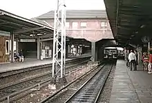 The Warschauer Straße S-Bahn station is located on the eastern side of Warschauer Bridge. The station's current configuration consists of a temporary footbridge and two platforms, one for trains inbound towards the city center, the other outbound towards Ostkreuz and Lichtenberg. The first station building opened on 11 August 1884 and stood until 1903. The second station building, designed by Karl Cornelius, stood from 1903 until 1924. The third station building, designed by Richard Brademann and constructed in 1924, was heavily damaged due to the destruction of Warschauer Bridge during World War II and required extensive reconstruction and alteration.[5]