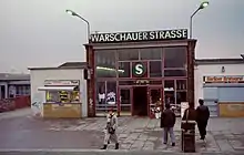 Warschauer Straße station is an S-Bahn and U-Bahn station on Warschauer Straße on the northern bank of the river Spree in the Friedrichshain neighborhood of Berlin, Germany. The two train stations as well as the trams that terminate adjacent to the U-Bahn station together accommodate over 85,000 passengers daily.[4]