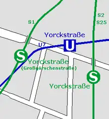 The adjacent Yorckstraße U-Bahn station of the U7 was built in 1971 by R.G. Rümmler. The underground station has two exits one each to one of the two S-Bahn stations, which are otherwise only connected by a short walk or (in the eastward direction) by bus. The next underground station in eastward direction is Möckernbrücke, where transfer is available to U1.[4]