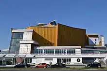 Hans Scharoun designed the building,[1] which was constructed over the years 1960–1963. It opened on 15 October 1963 with Herbert von Karajan conducting Beethoven's 9th Symphony. It was built to replace the old Philharmonie, destroyed by British bombers on 30 January 1944, the eleventh anniversary of Hitler becoming Chancellor.[2] The hall is a singular building, asymmetrical and tentlike, with the main concert hall in the shape of a pentagon. The height of the rows of seats increases irregularly with distance from the stage. The stage is at the centre of the hall, surrounded by seating on all sides. The so-called vineyard-style seating arrangement (with terraces rising around a central orchestral platform) was pioneered by this building, and became a model for other concert halls, including the Sydney Opera House (1973), Denver's Boettcher Concert Hall (1978), the Gewandhaus in Leipzig (1981), Walt Disney Concert Hall in Los Angeles (2003), and the Philharmonie de Paris (2014).[3][4]