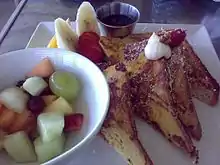 Corn bread, originating in Mexico and sweet Easter bread, originating in the British West Indies are incorporated into menus.[3] Bananas are versatile in local cuisine, and may be used to make banana crumble and desserts made from strawberries and cherries, fried as fritters, or flamed in rum.[2][8] Desserts with bananas are also baked in rum and brown sugar.[2] Jelly-roll or sponge cake, served with peaches or strawberries, bananas, custard, chopped nuts, and whipped cream and soaked in sherry is also a common dessert.[8] Another notable Bermudian dessert is the restaurant Fresco's chocolate mousse cake, which is served fresh out of the oven with roasted almonds, toffee, marshmallow ice cream, and pistachio creme.[4]